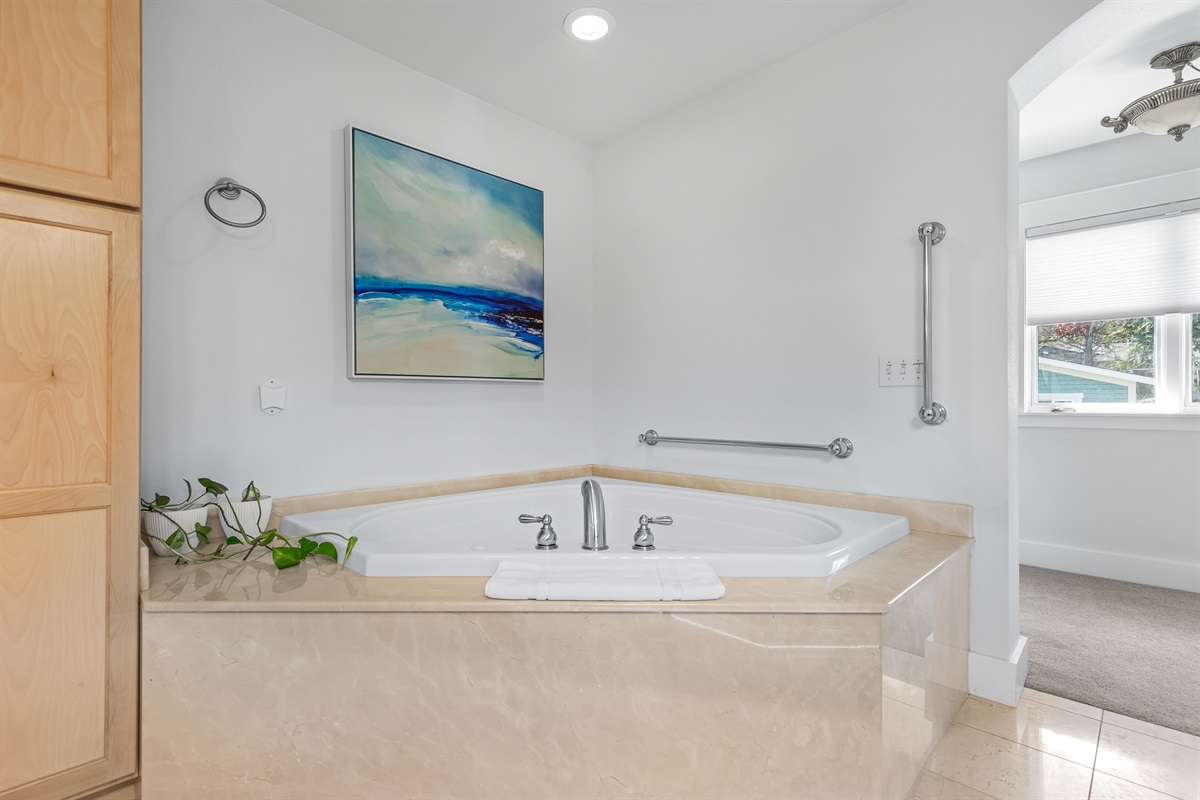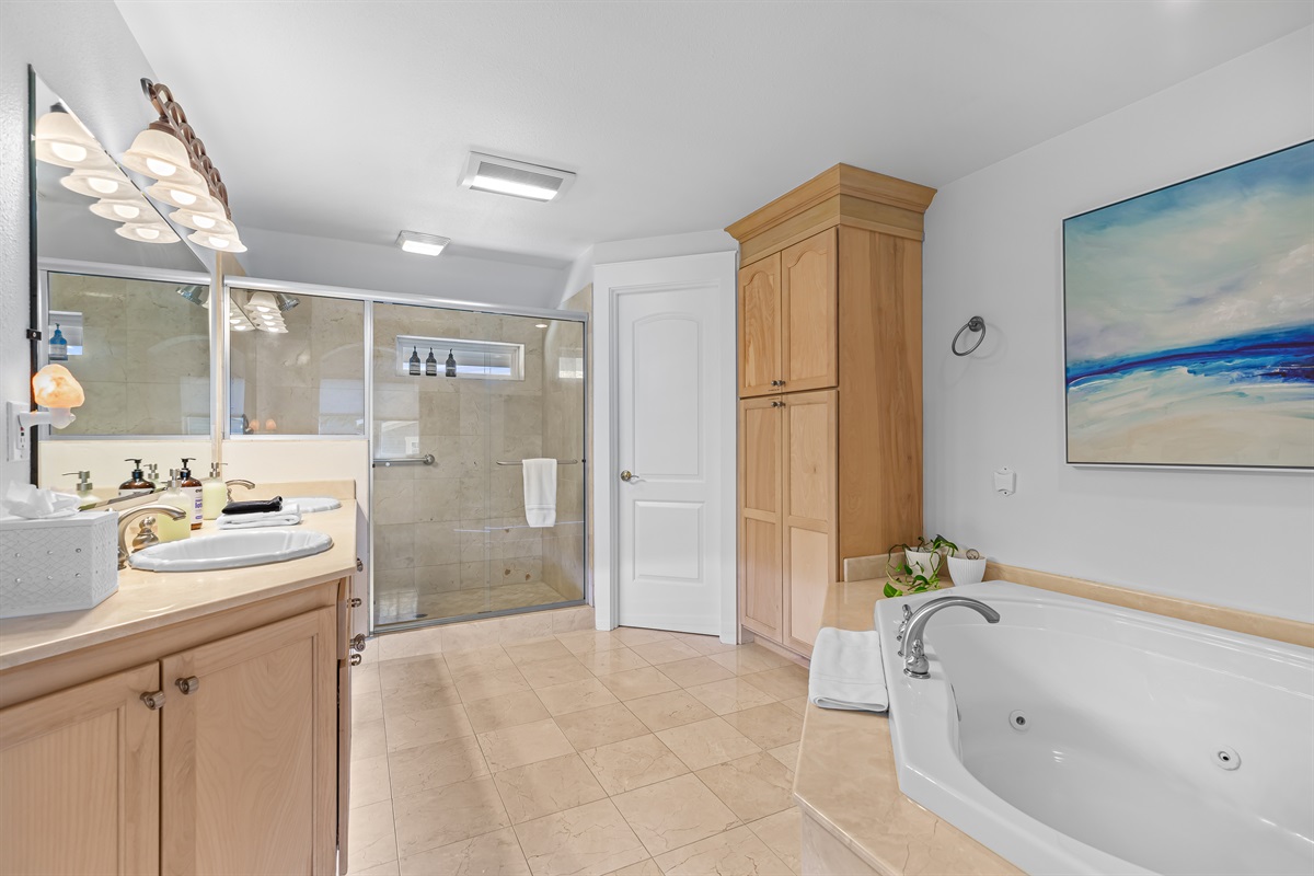 Bedroom 1: King Bed, ensuite bathroom with jetted tub, 55" tv