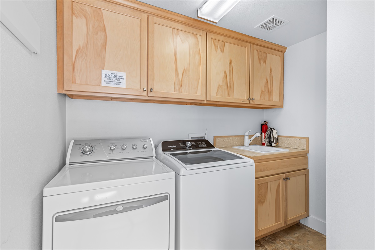 There is a full sized washer and dryer in the laundry room upstairs.
