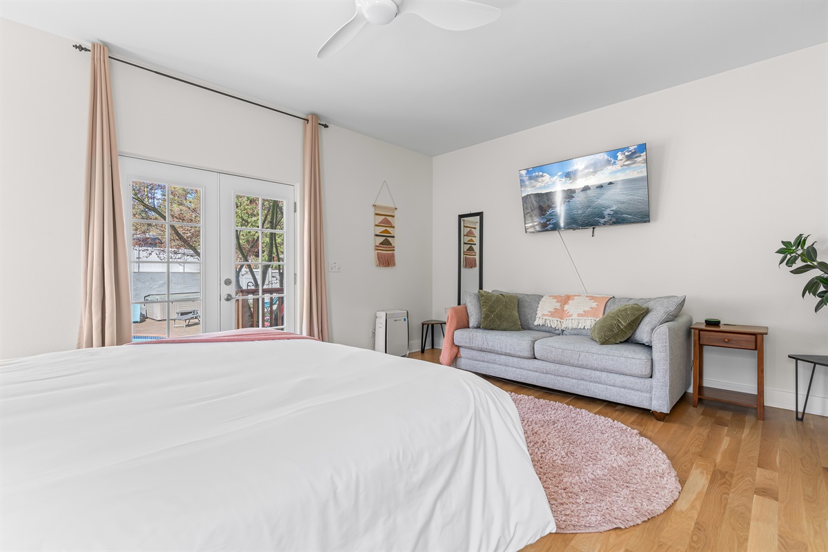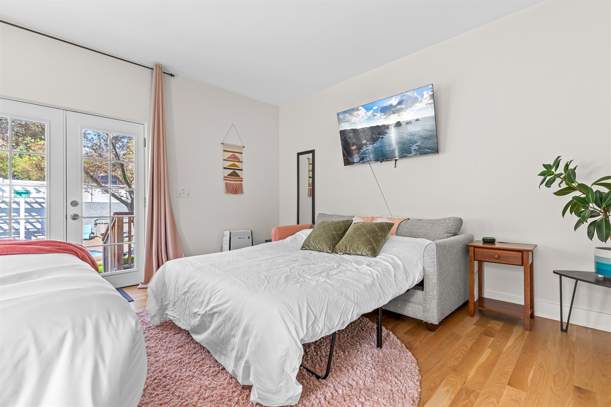 Bedroom 2: King Bed + Queen fold out couch, ensuite bathroom with french doors that open to the pool area, 55" tv