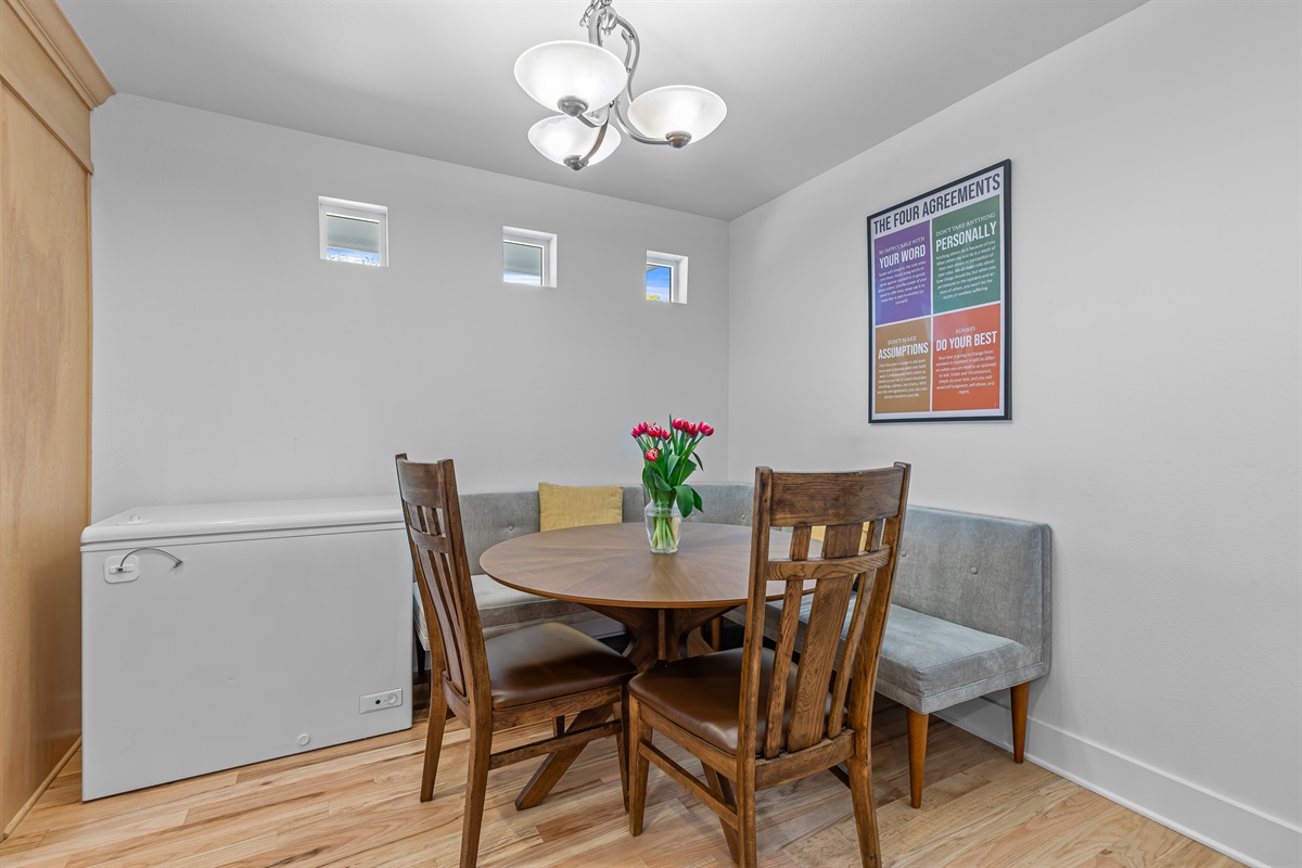You've got options! The formal dining room has a large table that seats 6 comfortably (or squeeze 8 in!). The breakfast nook seats 4 and kitchen island seats 2. On our better weather days you can enjoy a large outdoor table for 6 or a small bistro table for 2.