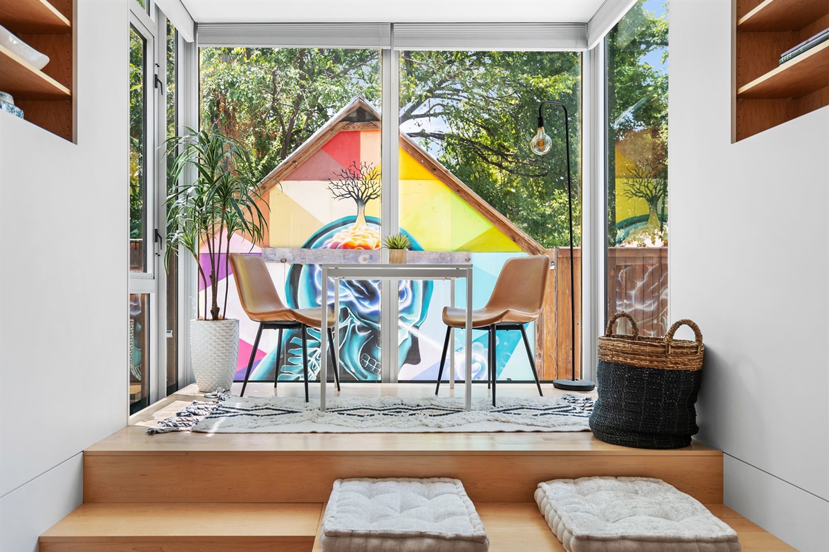 You've got options! There's a small dining room that seats 4 comfortably (or squeeze 6 in!). On our better weather days you can enjoy a picnic table in the backyard or another in the front. Although we have to admit late night on weekends the taco truck next door with stellar reviews hits the spot.