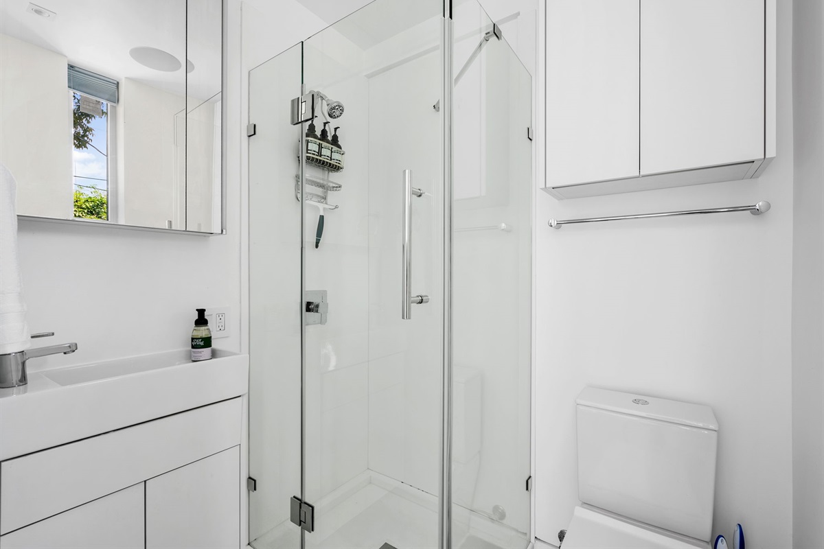 There are 3 bathrooms total. In the front house one bathroom with bathtub is in the hallway and the other is ensuite (also with a bathtub) in the large combined room (rooms 4 and 5). The casita has it's own bathroom with a shower. Towels, hair dryers, shampoo, conditioner and body wash are provided.