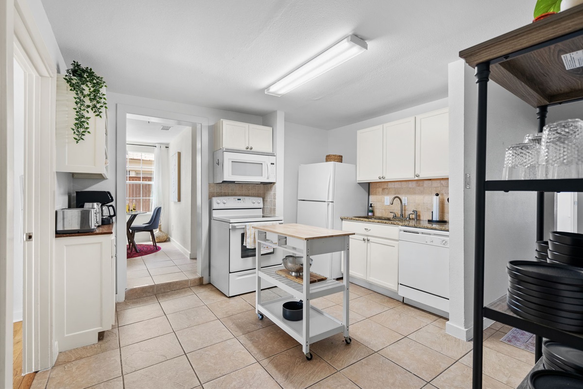 The kitchen is perfect for simple meal prep when you need a night in. You'll find all your basics to get breakfast, lunch or dinner on the table. Enjoy a 2-in-1 coffee maker with both Keurig and drip options. There is also a kitchenette in casita, so you can have a cup of coffee or some eggs before joining the rest of the group.