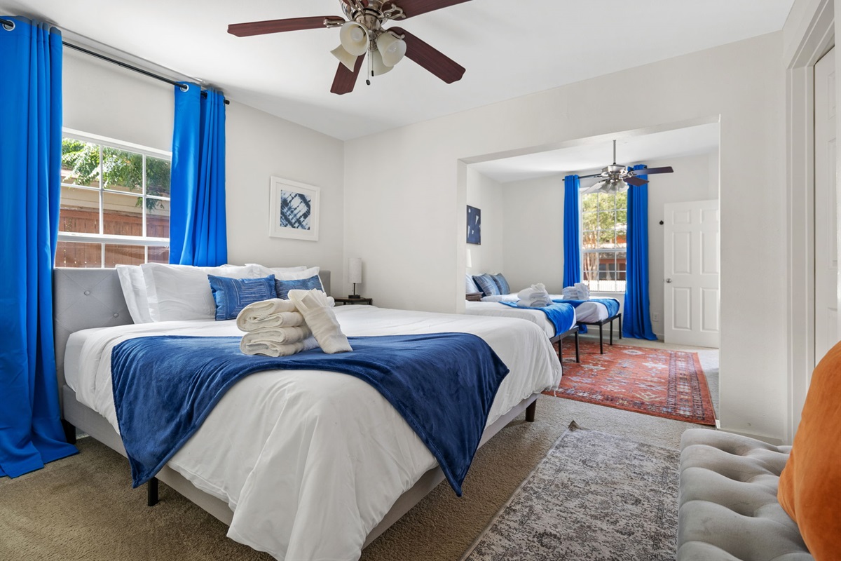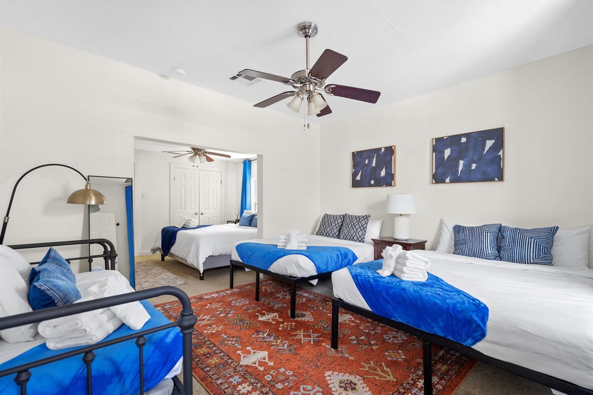 Bedroom 4 and 5: Bedroom 4 has a King Bed and bedroom 5 is packed with a queen bed, a full sized bed and a twin trundle (2 twins). Please note that the 4th and 5th bedrooms are combined. Unlike traditional setups, these rooms are creatively designed without a physical wall separating them, offering a truly distinctive and flexible accommodation experience. There is a full bathroom with bathtub that bedroom 4 and 5 share.