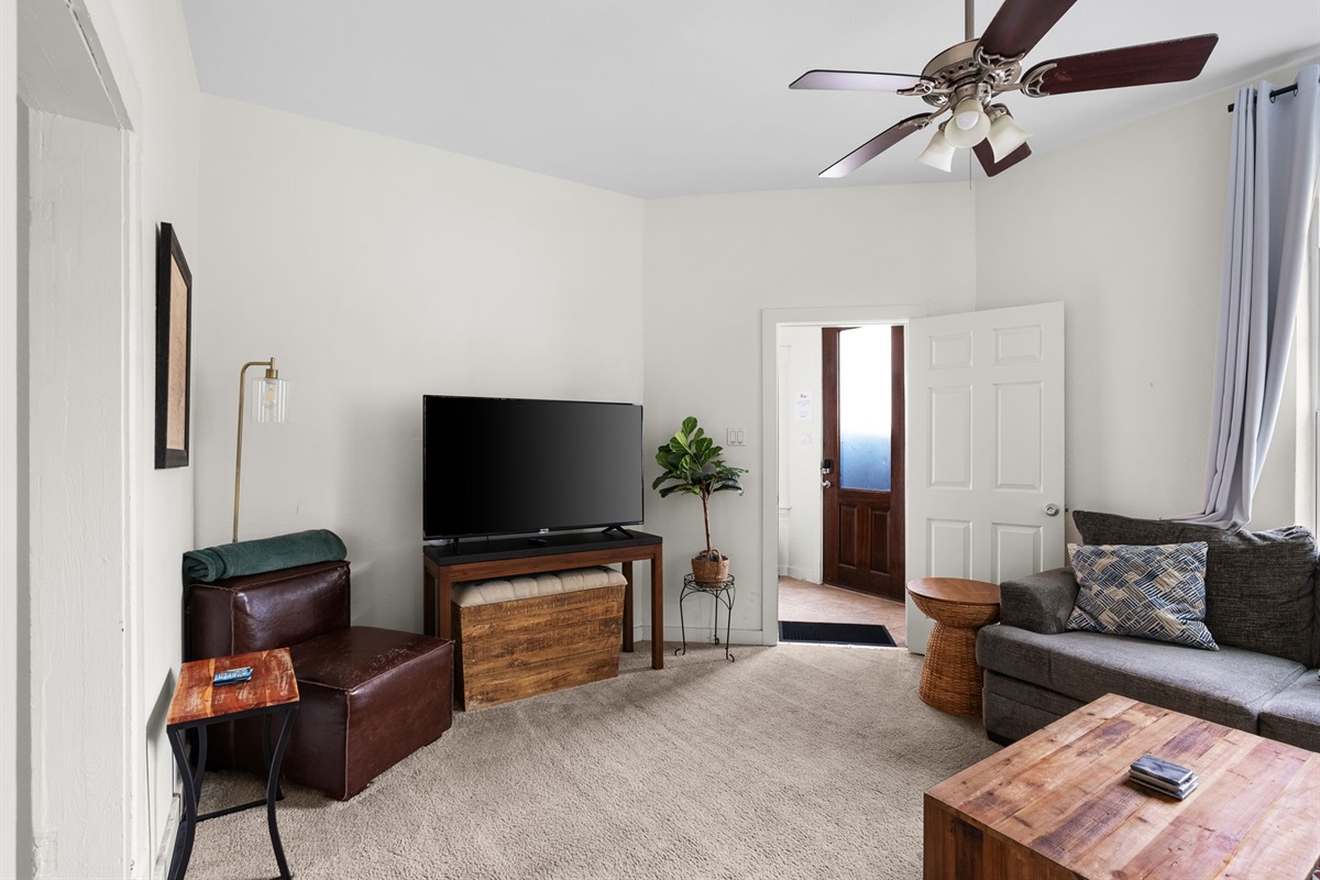 Relax on our large sectional sleeper sofa and stream your favorite shows on our Smart TV (Roku) or hang out with your friends. Enjoy access to Netflix, Hulu, Prime Video, and Apple TV by simply entering your password.